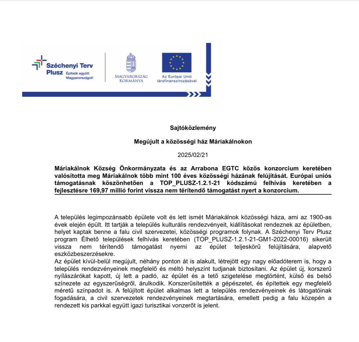Közösségi Ház Felújítása lezárult